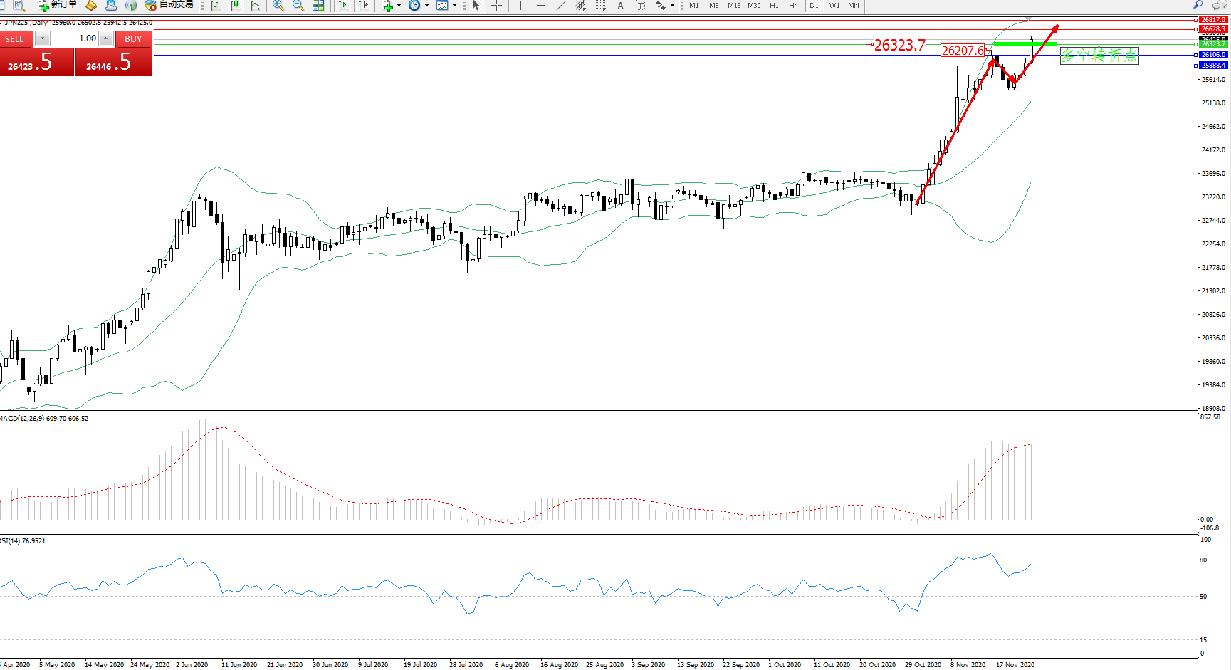 日经225指数11月24日(周二)收盘上涨643.63点,涨幅2.52%,报26171.00点。日本央行行长黑田东彦:日本央行希望支持银行强化其基础。日本国债持有量不是一个货币化的指标。将密切关注国内外市场状况。对增长型行业的投资意愿依旧不变。目前还未看到广泛的降价行为。企业清楚降价不会提振需求。不认为日本正在陷入通缩。酒店、餐厅等行业的业务可能很难恢复到经济衰退前的水平,这抑制了它们的支出欲望。旅游支援项目“Go To Travel”对消费者支出有正面影响。购买ETF在宽松的货币政策中发挥了重要作用。现在配置大规模财政措施是合适的。保证长期市场信任也是重要的。日本央行将帮助日本解决结构性问题。如果新冠疫情的影响变得更严重,持续时间超过预期,日本央行将采取额外的宽松措施。