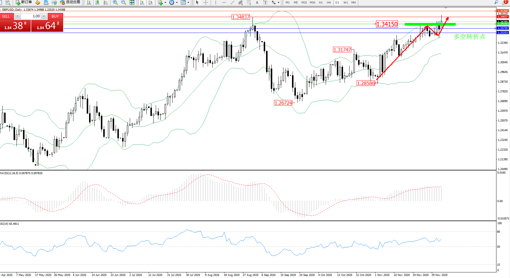 交易策略:1.34150上方看涨,目标1.34837、1.35368