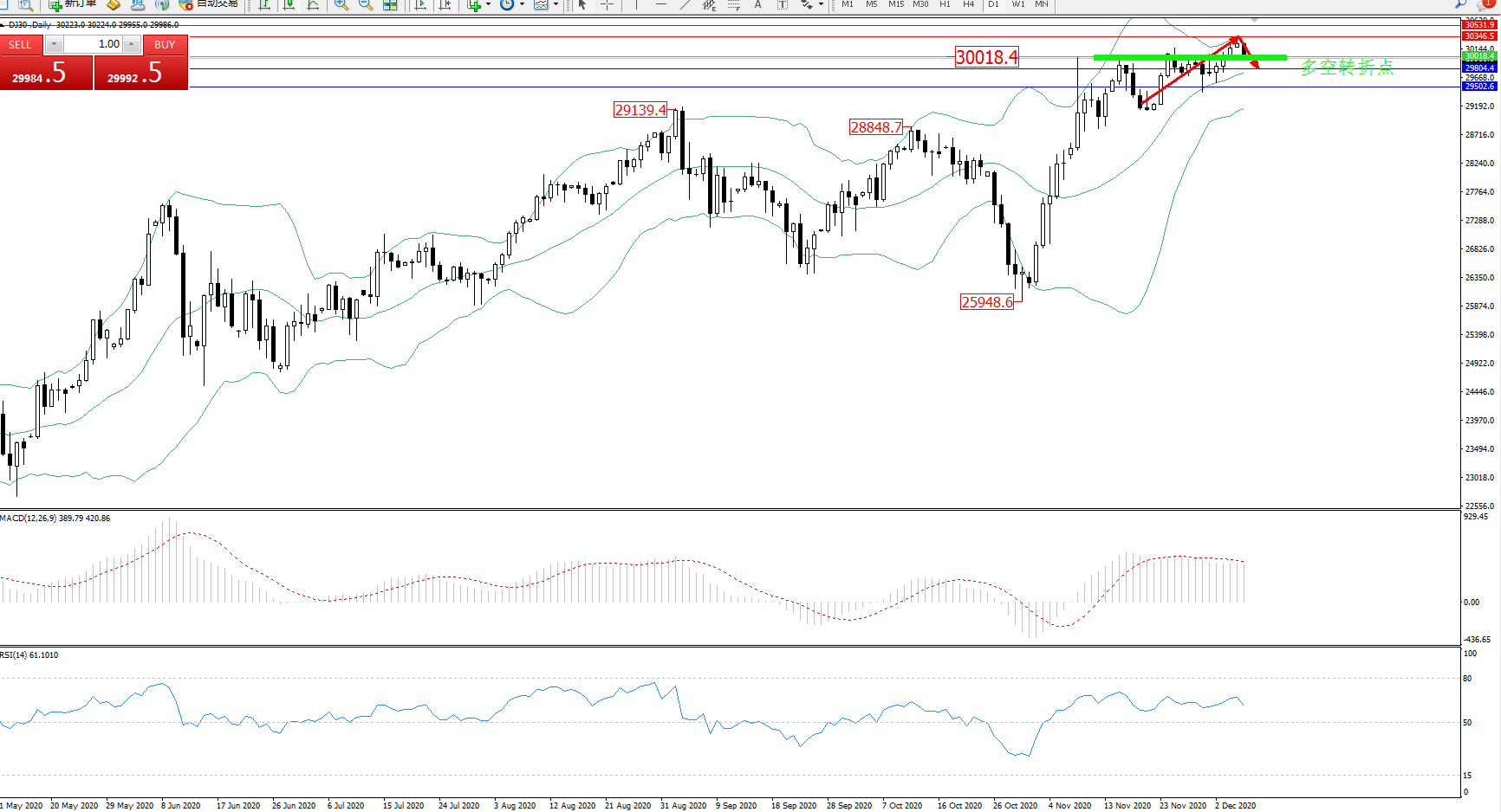 道琼斯指数DJ30—— 日K线图显示: