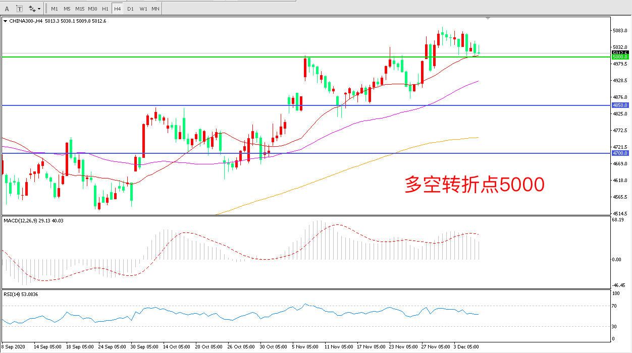 4小时图看,沪深300延续高位震荡,短期走势稍显疲软,但均线系统依然呈多头排列,5000成为下方支撑,MACD红柱减少,RSI指标走平,日内延续震荡概率较大。