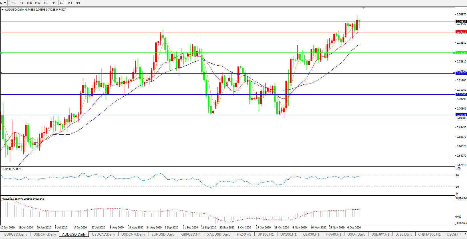 令人振奋的疫苗研发进展激励投资人转战风险较高资产,全球股市涨至纪录高点。Metals Focus的南亚资深研究顾问Harshal Barot表示“全球市场在疫苗推动的乐观情绪与美国财政刺激憧憬之间摇摆...因此冒险人气是正面的”。欧洲时段,澳元兑美元走高,创2018年7月以来近两年半新高,现报0.7475,涨幅0.86%,因全球风险偏好情绪进一步转暖,大宗商品价格走强,同时美元指数也继续表现疲软。澳元兑美元汇价因而在后市进一步上看0.75关键心理目标阻力位,而只要不跌破本周一的低点0.7373,强势上行的趋势就仍将维持。
