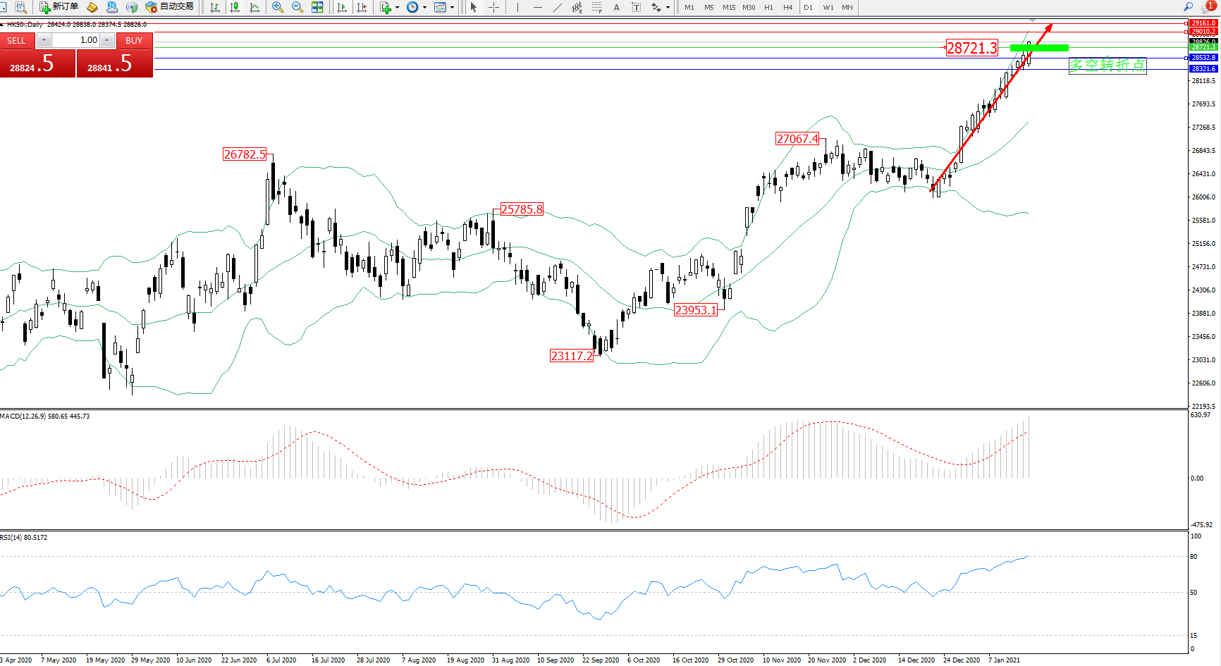 香港恒生指数1月18日(周一)收盘上涨288.91点,涨幅1.01%,报28862.77点;港股低开高走,主要指数全线收涨。恒指尾盘涨幅进一步扩大,恒生科技指数大幅上涨3.88%报9116点。盘面上,半导体板块集体拉升,华虹半导体尾盘涨幅扩大至近14%,中芯国际涨近6%;丘太科技发盈喜后大涨19.6%,恒大物业飙涨超26%;热门权重股腾讯、港交所盘中再创新高价,美团、小米均上涨。惟燃料电池股、保险股、在线教育股少数板块下跌。南下资金单日净买入230亿港元创历史记录,已连续19个交易日净买入。人民日报海外网援引香港无线新闻等媒体,香港特区政府卫生署卫生防护中心1月18日下午表示,香港新增107例新冠肺炎确诊病例,是继12月19日以来,再次单日超越过百宗确诊。其中102例为本地个案,42例源头不明。