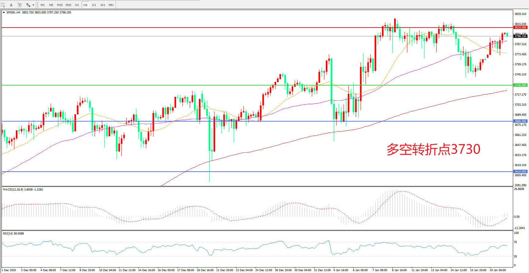 4小时图看,标普500触碰3810阻力后震荡回落,上行趋势遭到破坏,3730成为短线支撑,均线系统走平,MACD绿柱缩短,RSI指标走平,日内延续震荡概率较大。