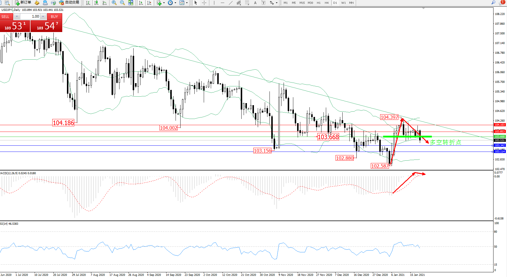 技术点评:低位多头动力强势拉升至104.397附近节点后遇阻开始纠结于中上轨区间窄幅整理,布林带指标呈缓慢张口走势中,关注中轨附近关键节点,MACD指标低位多头动力维持震荡上移至0轴线上方弱势徘徊中,RSI指标纠结于50均衡线附近弱势整理中;