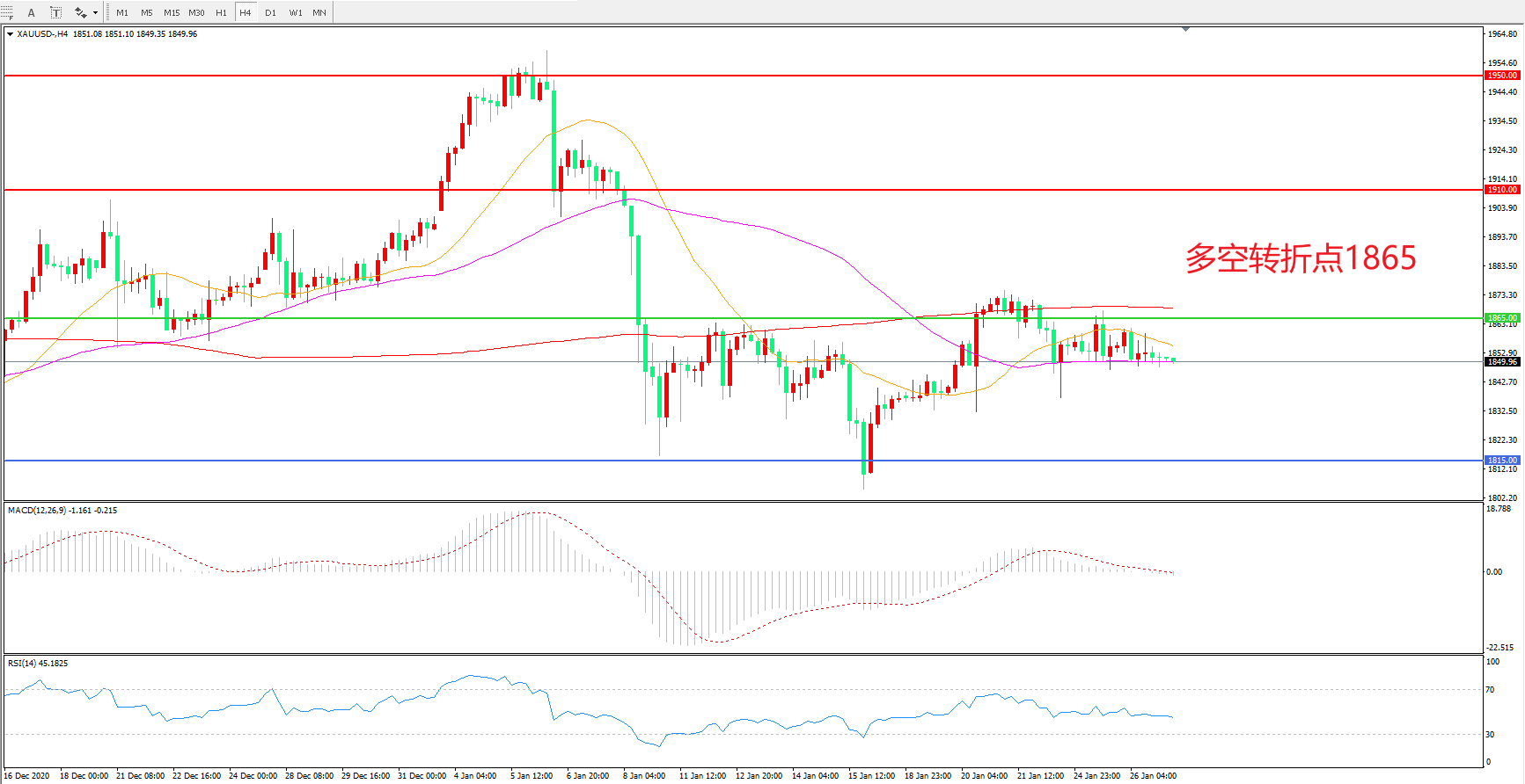 周二(1月26日),美国总统拜登表示,他愿意调整其规模1.9万亿美元的疫情纾困方案,这代表最终版本的新一轮刺激方案远没有提议的那么多,市场衡量拜登新刺激最终规模缩水的可能性和短期内不会出台的前景,金价延续低位震荡,收报1849.40美元/盎司。目前无论是多头还是空头都缺乏推动金价突破的关键诱因,而本周美联储的利率决议可能成为成为这个推动力。