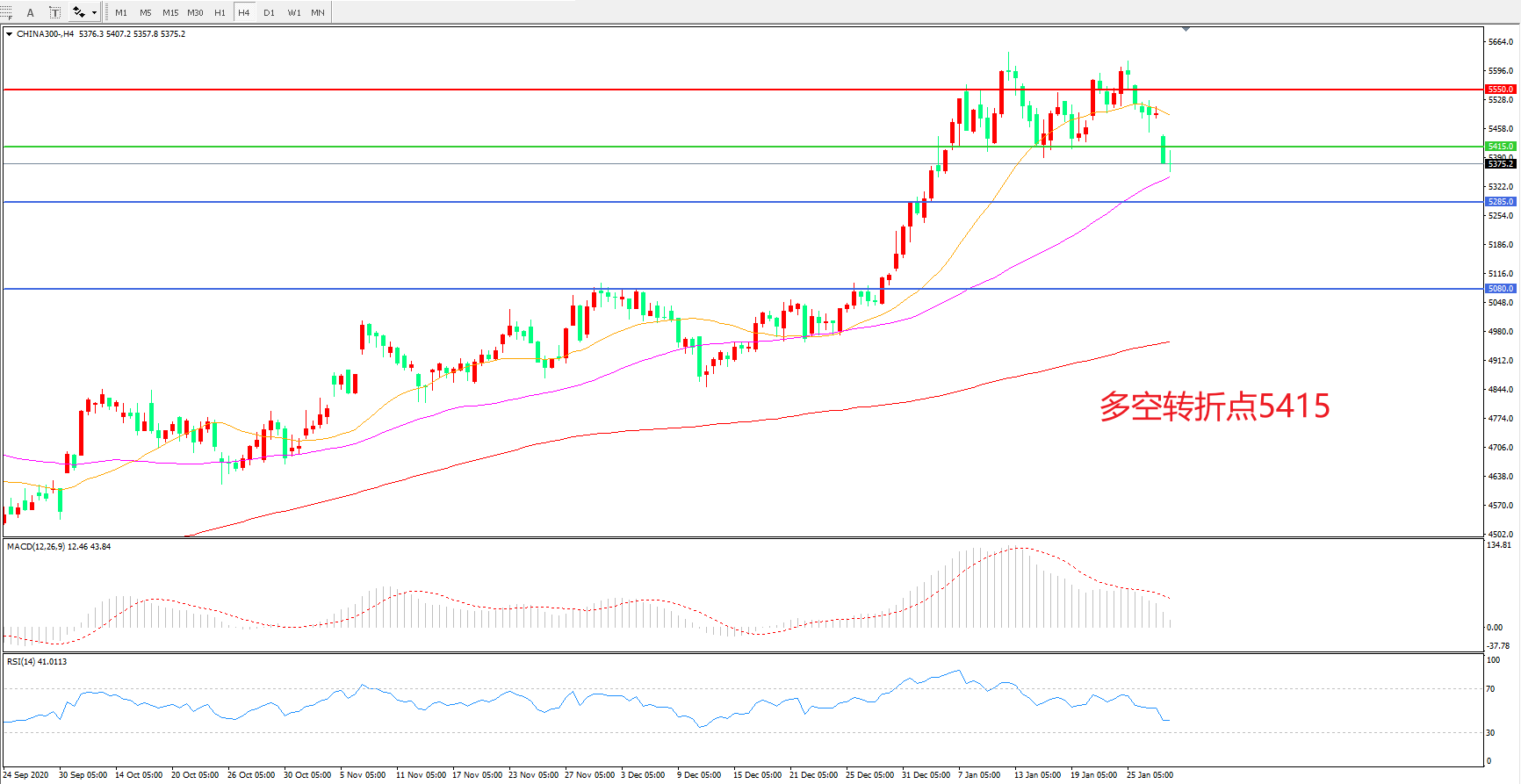 4小时图看,沪深300低开低走,前期整理区间被跌破,5415成为短期阻力,55均线成为下方支撑,MACD红柱缩短,RSI指标走平,日内如不能明显反弹,震荡回调的概率较大。
