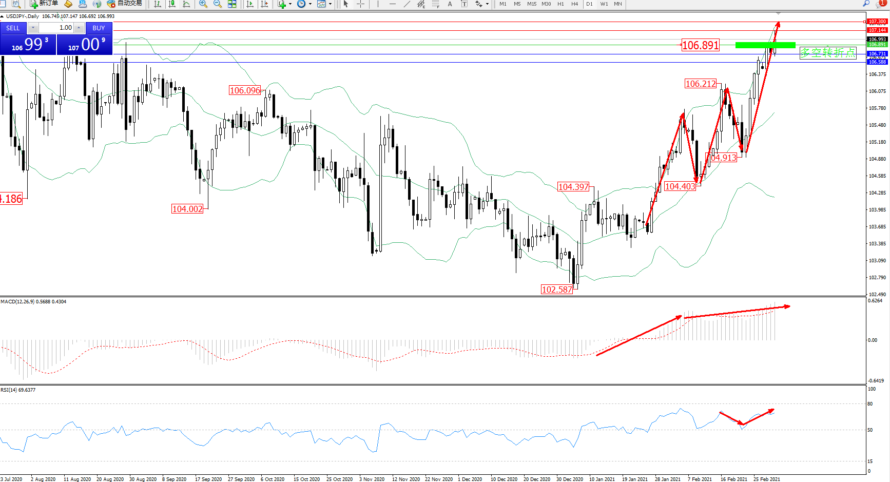美元兑日圆不断拉升至107.000附近持续向上移动中,日本央行股价日内继续被爆炒,显示投资者仍押注其将扩大资产收购规模,将手伸向更广泛的市场领域。而日本央行官员片冈刚士日内也宣称,日银需要采取措施平抑债市收益率,这一表态释放的额外宽松政策预期也令日元汇价额外承压,与美元的强势正好构成反差。同时,日本本周以来PMI数据表现的低迷,也与美国同类数据的强势构成反差,进一步拖累日元下行;投资者眼下正在观望美国此后发布2月系列就业数据,这一系列数据若向好,再结合上美国国会此后通过疫情援助法案和基建法案以进一步促进经济增长的预期,将带领美元指数进一步走强,令美元兑日元顺理成章升至107关口上方。