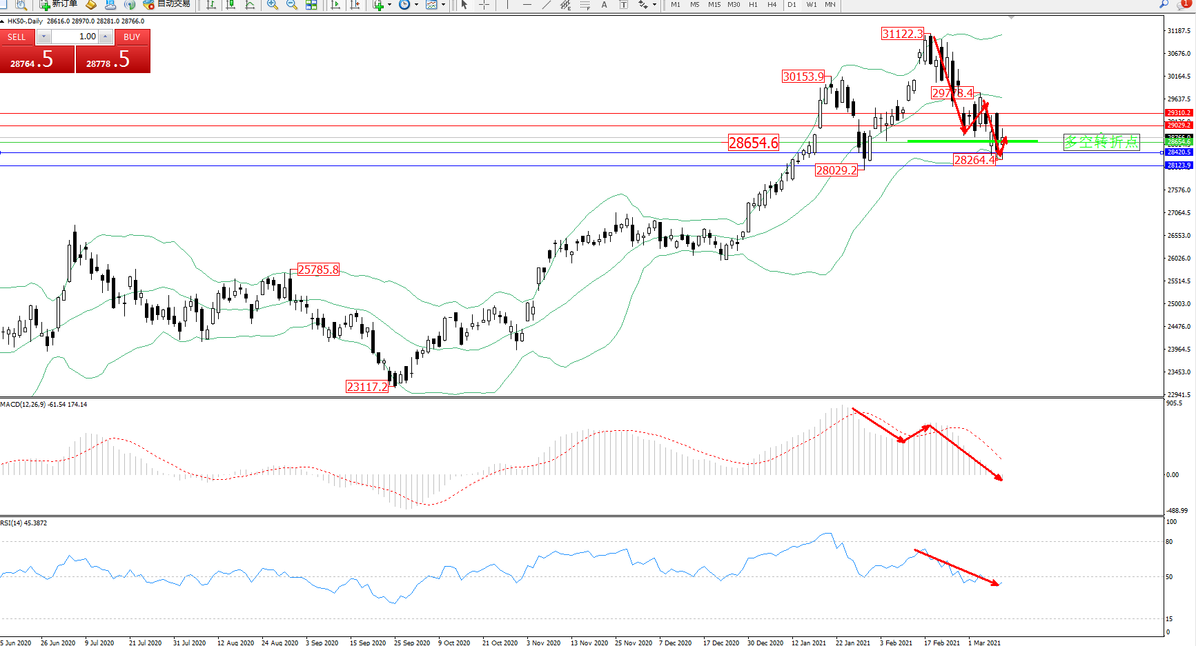 技术点评:高位空头动力维持震荡下行态势良好,触及布林带指标下轨附近节点28264位置附近后,得到短暂支撑,开始处于中下轨区间弱势整理,空头下行动力依旧存在,布林带指标呈张口走势后缓慢平移中,MACD指标处于高位空头动力持续震荡下移至0轴线下侧弱势徘徊,RSI指标纠结于50均衡线下方弱势整理中;