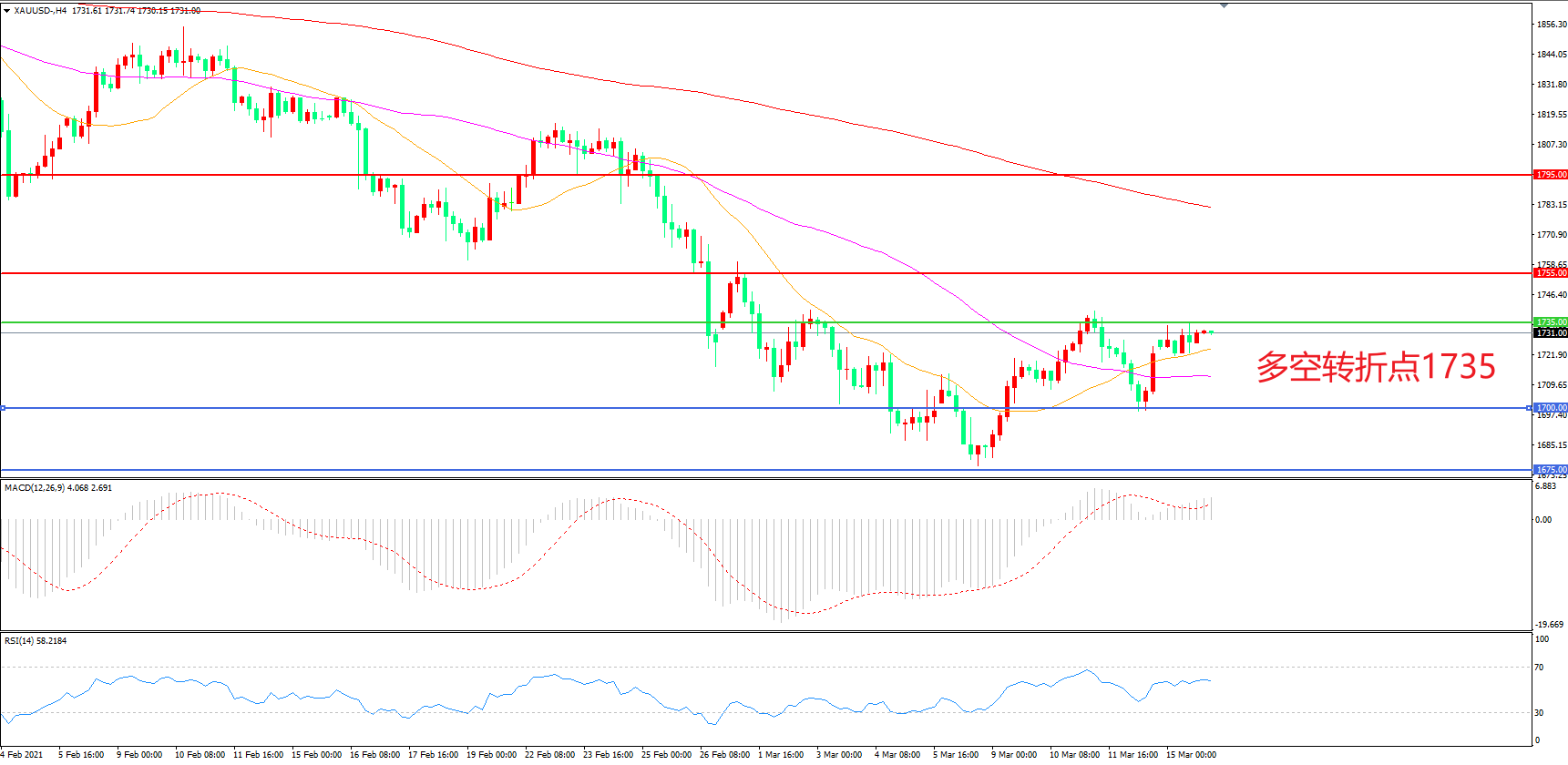 随着拜登1.9万亿美元刺激法案的通过以及美国即将分发补助显然对风险资产具有正面影响。人们越来越相信,美国将在今年夏天恢复正常,可能会推高美元走势,进而对黄金施压。目前黄金的反弹被视为美联储本周货币政策会议前的短暂恢复,因此动能有限。市场参与者正拭目以待周三举行的美联储会议,并密切关注更广泛的市场风险情绪、美债收益率以及美元价格动态,以决定黄金的走势。
