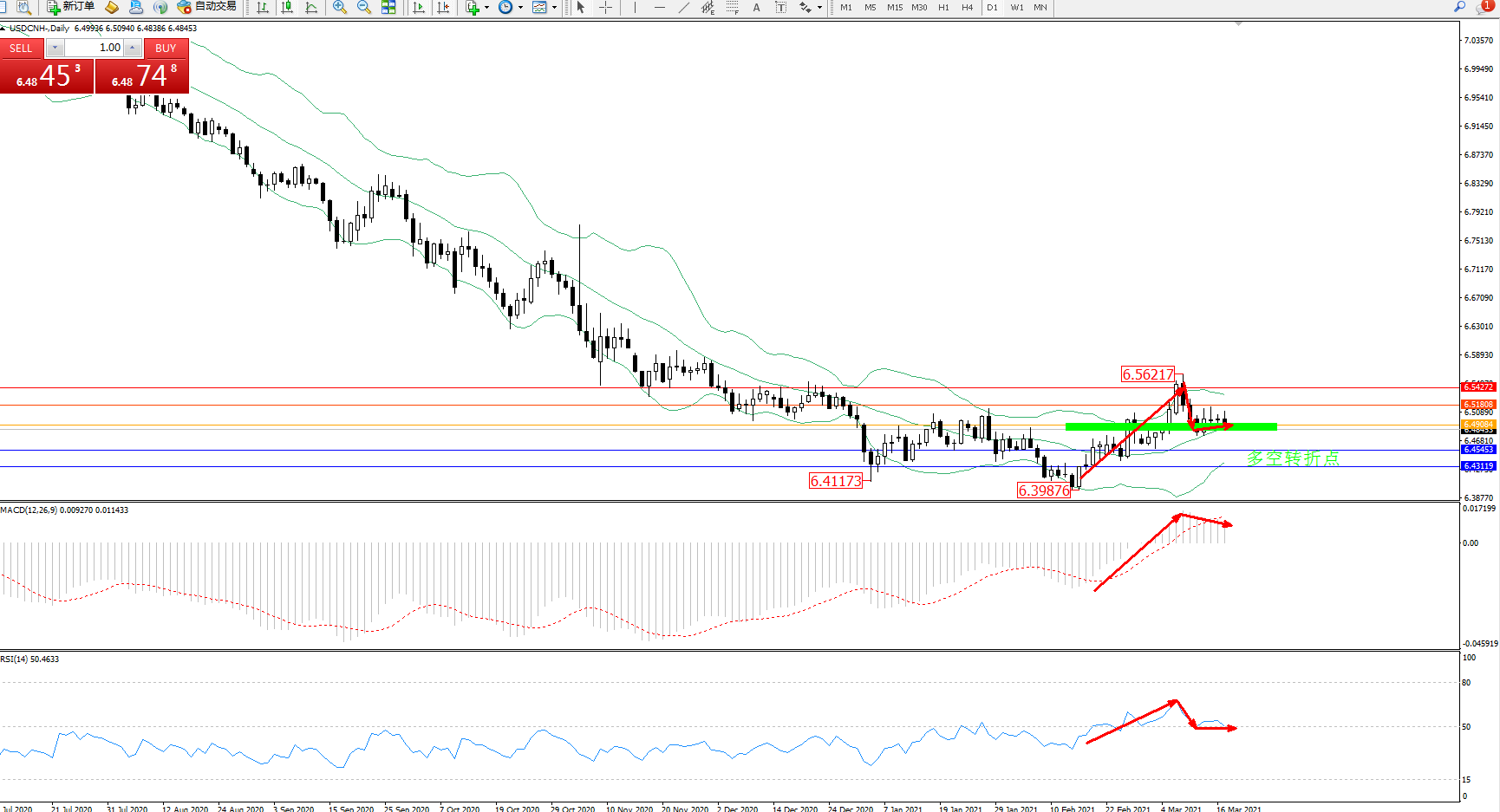 美元人民币USDCNH——日K线图显示: