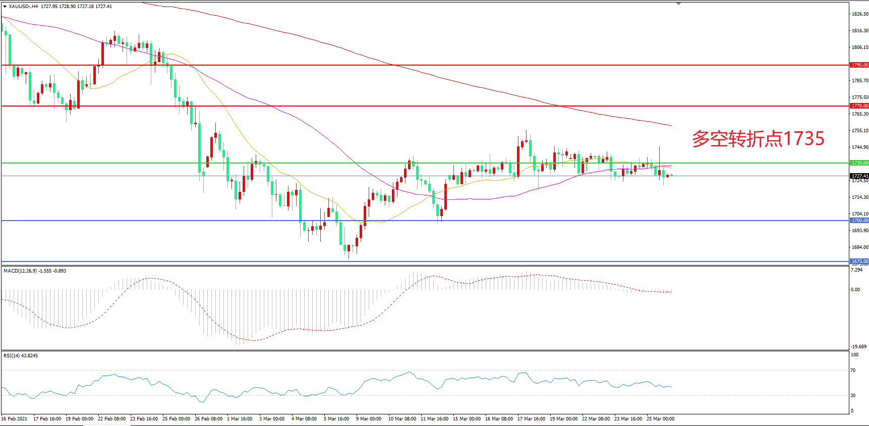 周四(3月25日),美国主要经济数据表现抢眼,当周初请失业金人数超预期下降,美国去年四季度GDP增速上修,优于预期,良好的数据表现提振了市场对美国经济的信心,美元指数震荡上行,刷新4个月来高位,现货黄金承压下行,收报1728.28美元/盎司。