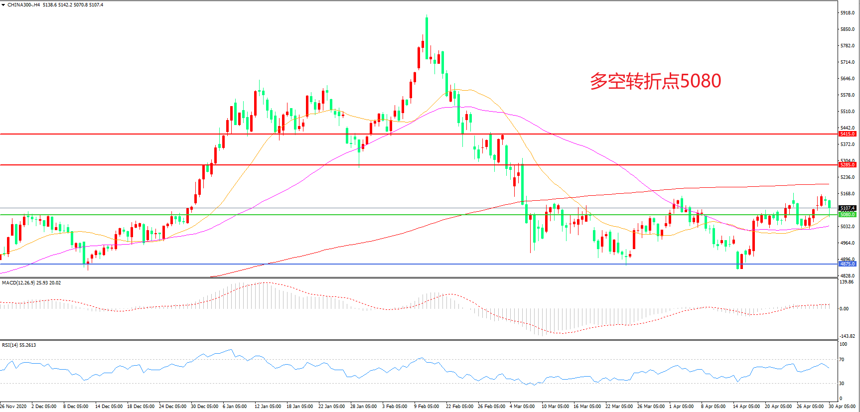 4小时图看,沪深300以55周期均线为依托小幅走高,区间震荡迹象明显,5030成为下方支撑,200周期均线成为上方阻力,MACD红柱增加,RSI指标走平,日内延续震荡概率较大。