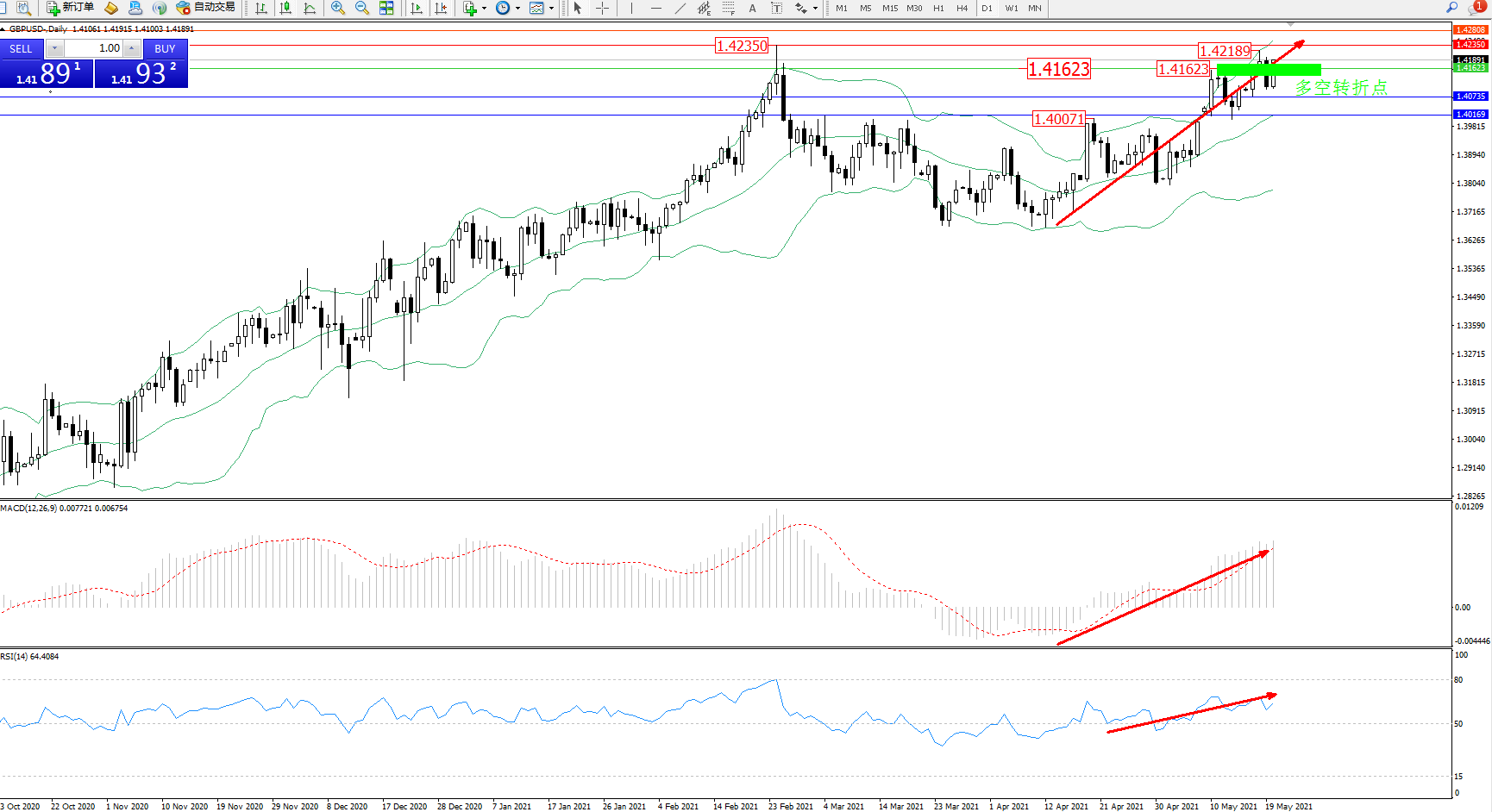 交易策略:1.41623上方看涨,目标1.42350、1.42808