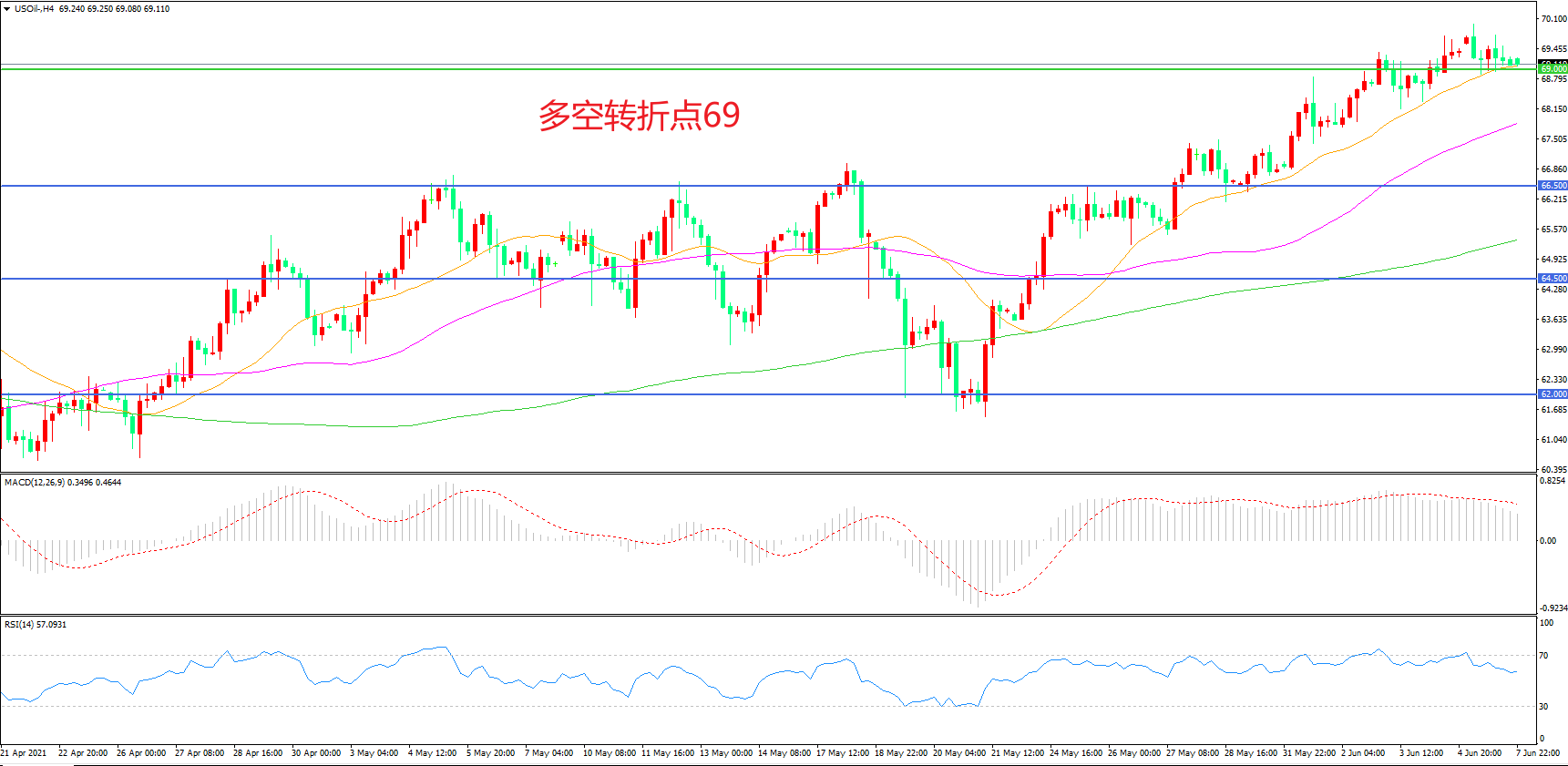 周一 (6月7日),国际原子能机构称,美伊谈判已进入决定性阶段,市场等待6月10日本周四的第五轮伊朗核谈判结果,美国WTI原油高位窄幅震荡,收报69.10美元/桶,如果本轮不能达成协议油价有望再度冲高,如果美伊达成协议,将明显增加原油供应,引发投资者获利了结。