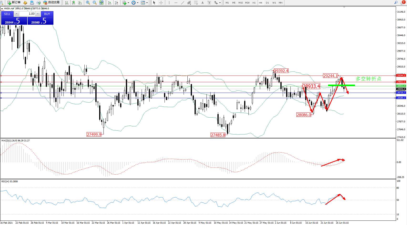技术点评:低位多头动力呈W底形态反转上扬,抵达29244位置后遇阻,出现快速回撤下行走势,空头动力不断伺机入场,有触及布林带指标中轨附近态势,MACD指标低位多头动力上移至0轴线上方多头区域维持整理平移,RSI指标处于多头区域维持震荡后回撤下行;