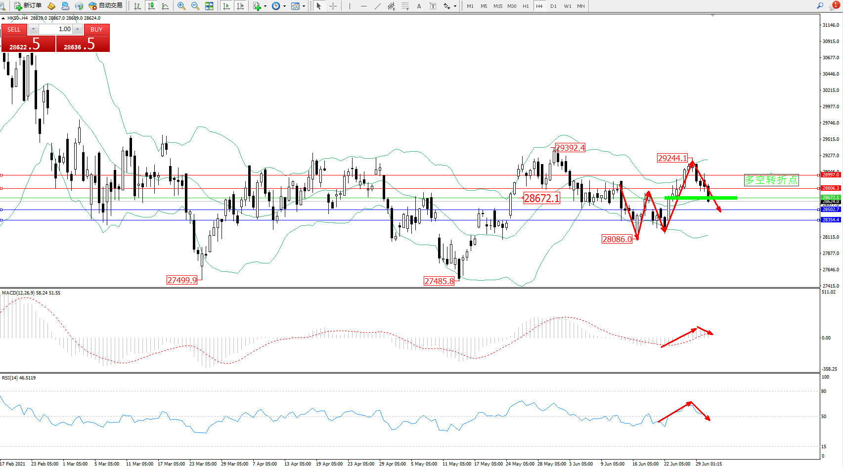 技术点评:低位W底形态反转上移后,高位抵达29244位置节点遇阻回撤,跌破布林带指标中轨附近节点后有继续下行态势,布林带指标呈张口走势后开始缓慢收口,MACD指标处于0轴线上方多头区域维持整理平移中,RSI指标处于多头区域维持窄幅震荡回撤,跌破50均衡线不断下行中;