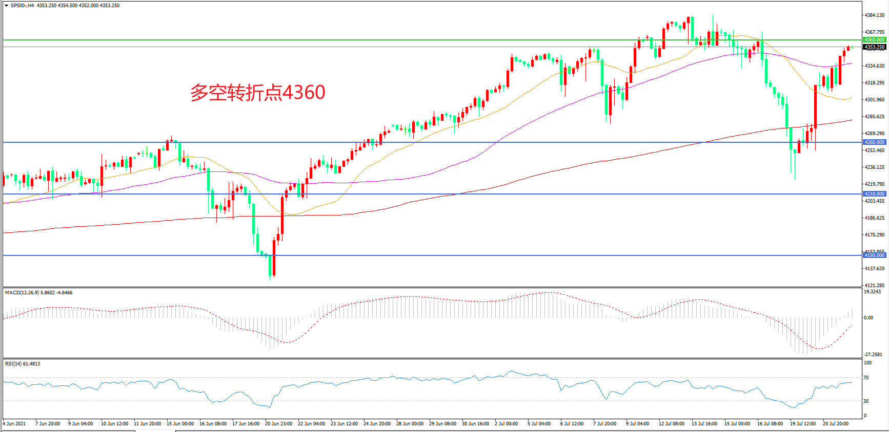 4小时图看,标普500回踩200周期均线后大幅反弹,目前价格再度逼近前高,整体表现偏,4360成为多空分水岭,均线系统走平, MACD红柱增加,RSI指标走平,日内震荡上行概率较大。