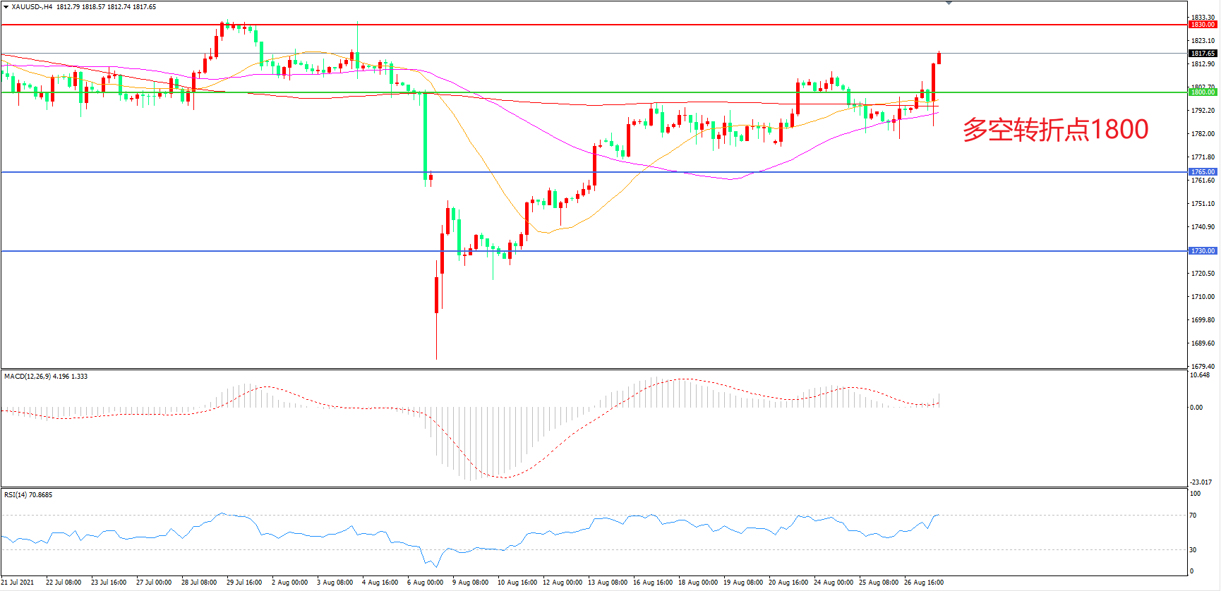 上周五(8月27日),备受瞩目的美联储杰克逊霍尔全球央行年会召开,美联储主席鲍威尔亲口承认年内可能缩表,但缩表时间并不意味着加息时间。现货黄金大幅拉升,收报1817.65美元/盎司。本周市场将再度迎来非农就业数据,目前投资者普遍认为,非农就业人口将增加76.3万人,如果非农数据不及预期,美元可能再度迎来下跌,金价将顺势开启新一轮涨势。