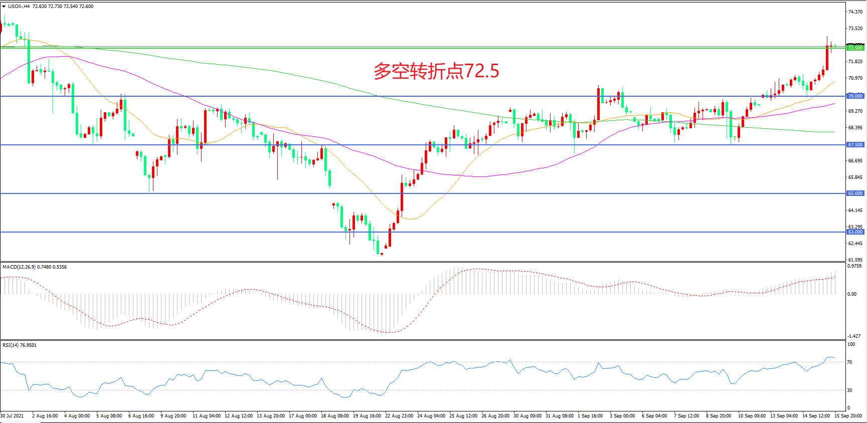 4小时图看,油价长阳拉升,强势突破前期阻力,短线走势偏强,均线系统呈多头排列,MACD红柱增加,日内震荡上行概率较大。