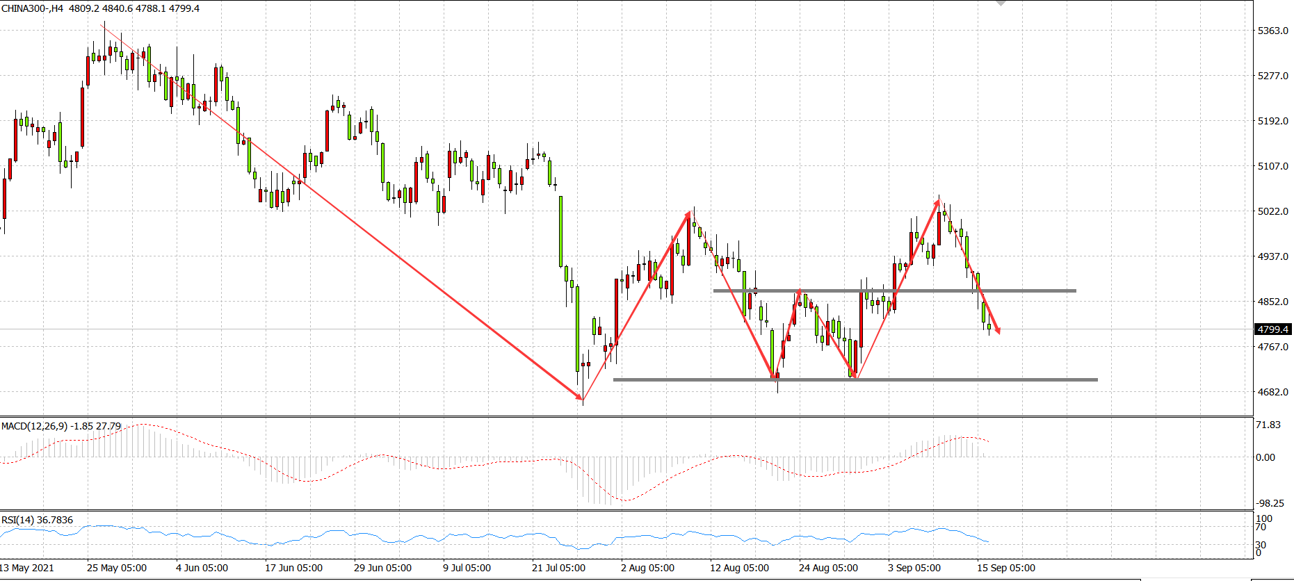 4小时图周期看,沪深300较强势的空头趋势背景,本周反弹结束继续回归空头,MACD柱子明显从零轴之上缩短往零轴之下形成,同时RSI指标也是下穿数值50朝着超卖区域下行,连续的抛压之后价格即将面临前期低点支撑,重点关注4700一线的支撑力度,日内延续下行概率较大。