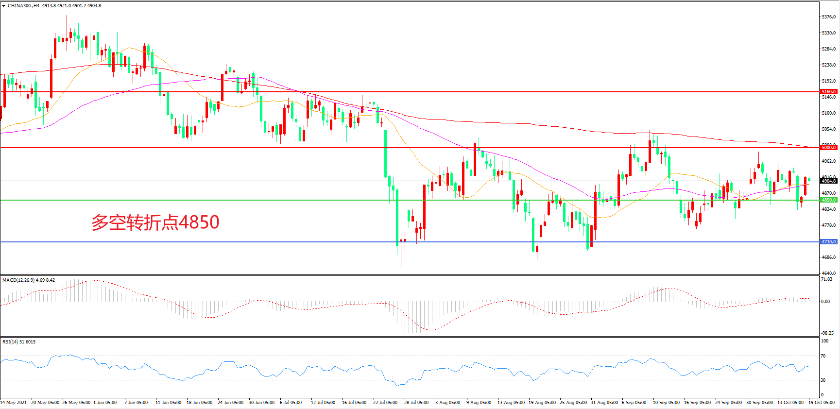 4小时图看,沪深300高开高走,区间震荡形态明显,5000点成为上方阻力,4850成为下方支撑,MACD红柱缩短,RSI指标走平,日内延续震荡概率较大。