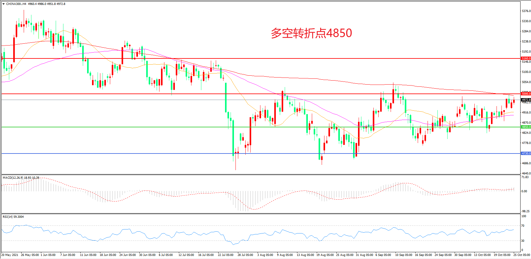 4小时图看,沪深300以均线系统为依托震荡走高,200周期均线成为上方阻力,4850成为下方支撑,MACD红柱增加,RSI指标走平,日内高位震荡概率较大。