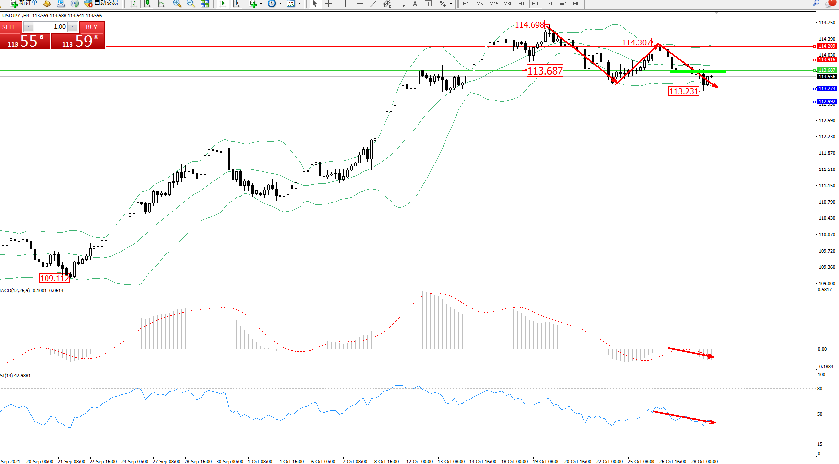 技术点评:短期空头动力延续布林带指标通道内维持震荡向下移动,低位抵达113.231位置后短暂整理,空头动力有继续向下移动态势,布林带指标呈持续整理平移中,MACD指标处于0轴线下方空头区域维持整理平移,RSI指标处于50均衡线下方空头区域窄幅整理中;