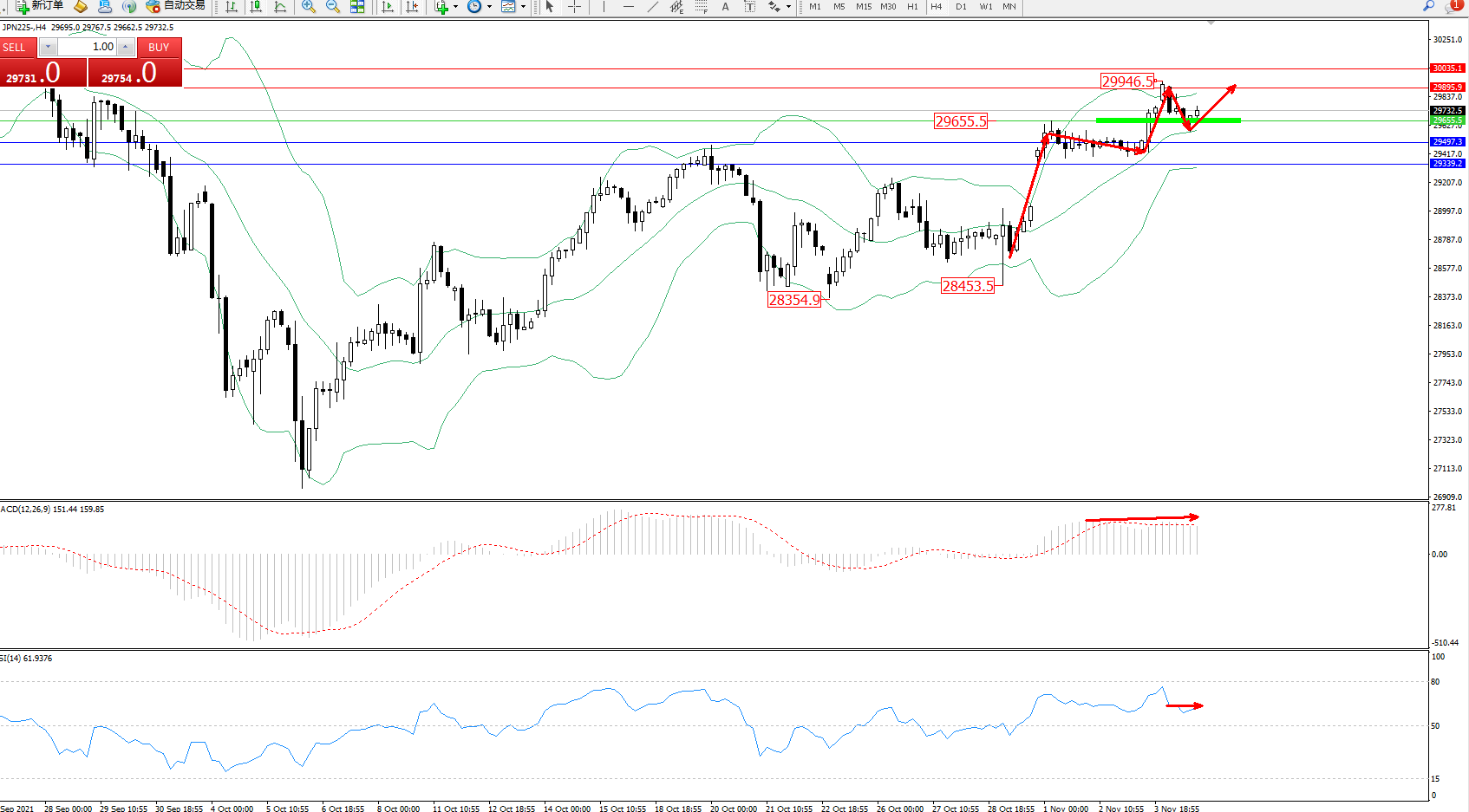 技术点评:多头动力延续布林带指标通道中上轨区间持续震荡上扬,高位抵达29946附近节点后开始整理平移,短期多头动力有继续上移迹象,布林带呈收口走势后有继续上移迹象,MACD指标处于多头区域维持整理平移,RSI指标处于多头区域维持窄幅整理弱势徘徊;
