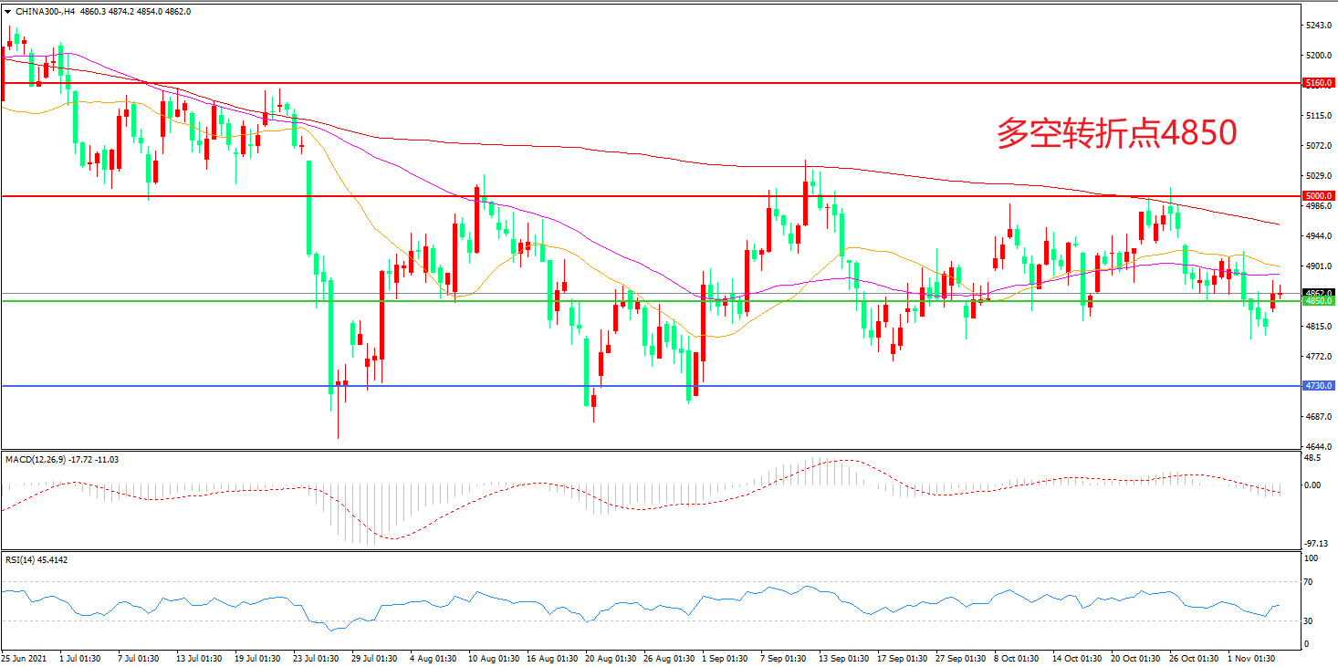 4小时图看,沪深300连续下行后小幅反弹 ,但整体表现依然弱势,均线系统呈空头排列,MACD绿柱增加,RSI指标走平,日内震荡下行概率较大。