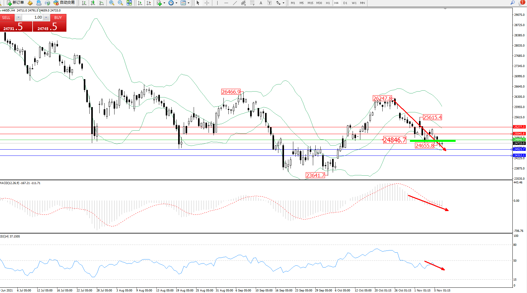 香港恒生指数11月8日(周一)收盘下跌106.74点,跌幅0.43%,报24763.77点;港股三大指数全天表现弱势,科技股再度低迷,致恒生科技指数跌1.32%报6193点,今日大市成交额为1219亿港元,南下资金逆势净流入1.73亿港元。上周五,辉瑞宣布其新冠口服药物Paxlovid减少新冠肺炎非住院患者的住院或死亡率高达89%,多项数据显著优于默沙东的Molnupiravir。另外,港府期望于明年2月,即粤港澳大湾区发展规划纲要三周年之时,能与内地展开较有规模的免检疫通关。