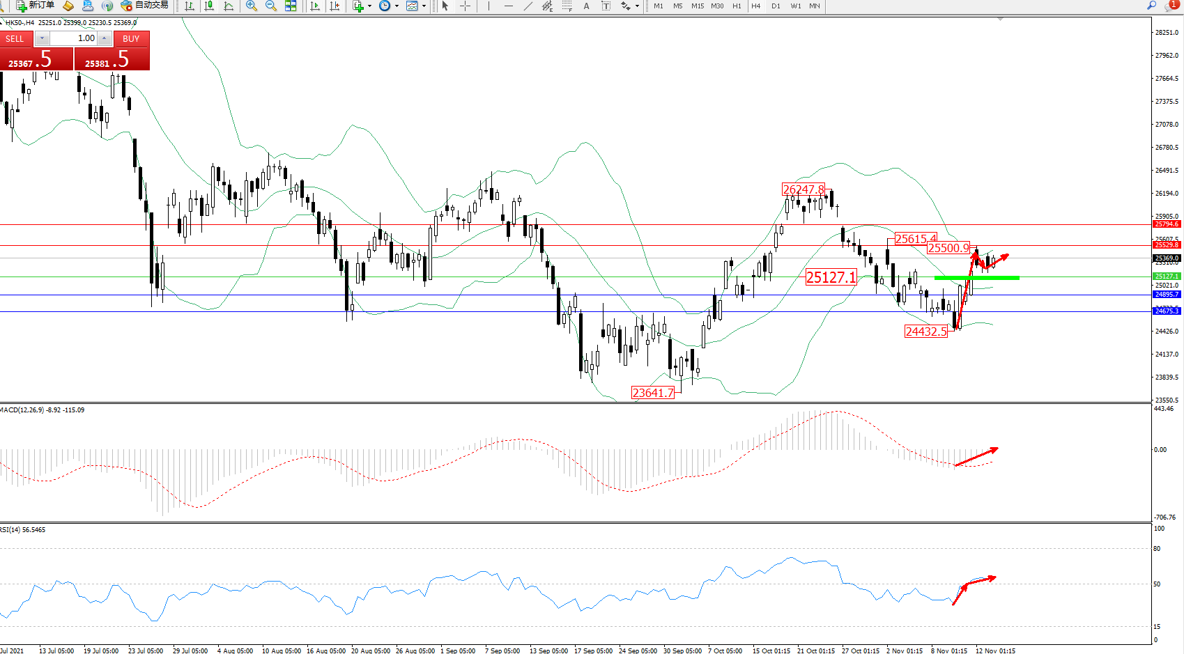 香港恒生指数11月15日(周一)收盘上涨62.94点,涨幅0.25%,报25390.91点;港股三大指数收盘涨跌不一,恒生科技指数涨0.54%报6601点。大型科技股多数上涨,京东、腾讯、网易涨超1%,快手跌1%。生物科技股集体走高,在弱势行情中表现尤为亮眼,腾盛博药飙涨超35%领衔上涨;今日大市成交额为1185亿港元,南下资金净流出1.03亿港元。摩根士丹利发表中国资本市场2022年展望报告表示,在经历了与新兴市场相比表现不佳的一年,以及重大的监管重置之后,该行仍然认为MSCI中国指数于2022年仍存在风险,盈利面对逆风、流动性持续紧张、中美非贸易局势紧张,以及近期内房市场波动,该行指偏爱A股多于离岸中国市场。该行对中资股维持相对审慎取态及“与大市同步”评级,料明年底上升空间有限。该行对恒指基本情境下2022年年底目标预测,由24,400点上调至25,000点,相当预测市盈率11.1倍,料明年每股盈利按年升10%。