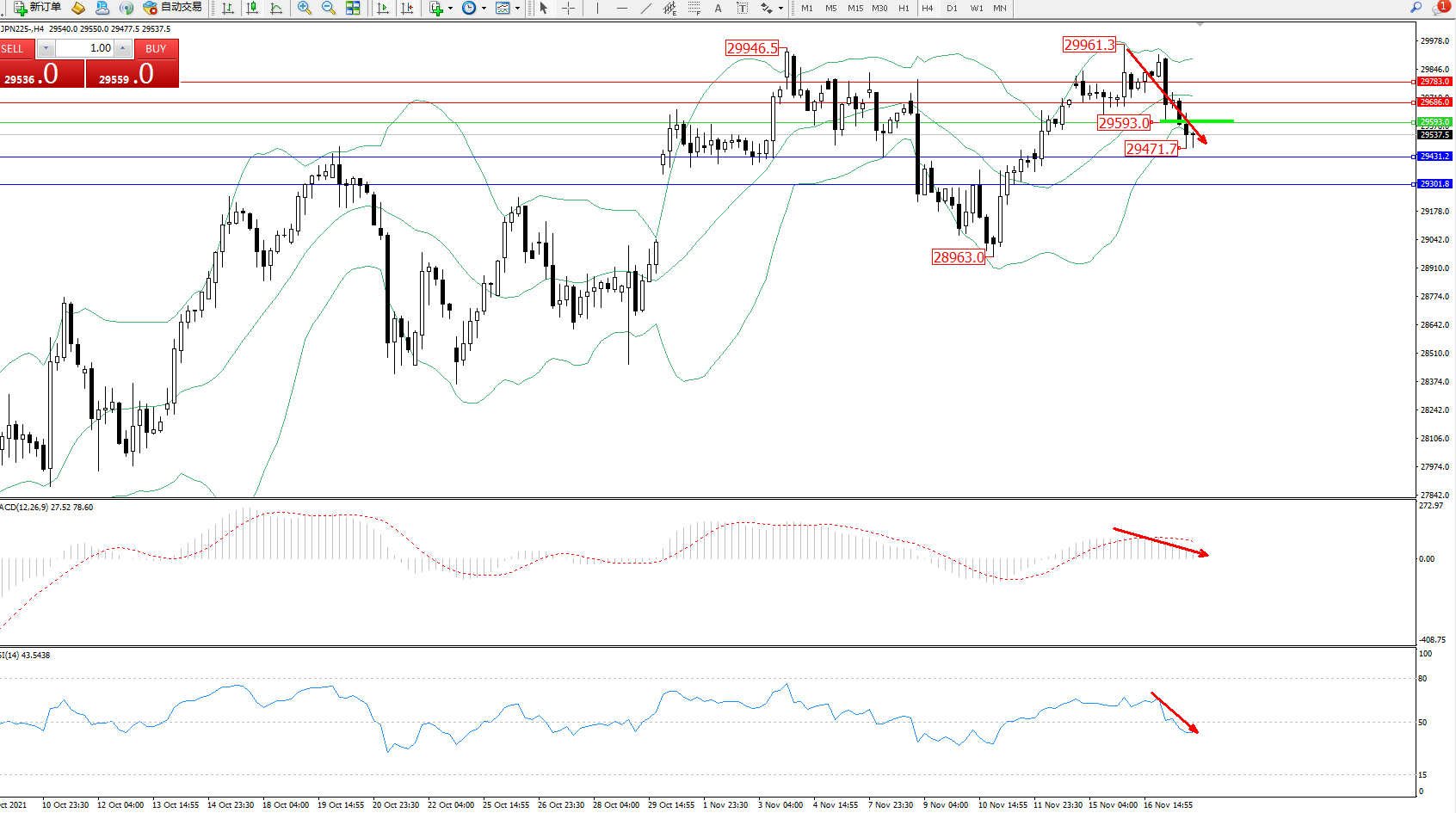 技术点评:多头动力延续布林带指标通道中上轨区间持续震荡上扬,高位抵达29961位置后短期遇阻整理回撤,空头动力伺机入场,强势下行至布林带指标下轨至29471位置后得到短暂支撑整理,空头动力有继续回撤下行迹象,布林带指标呈收口走势后有缓慢张口迹象,MACD指标维持多头区域整理平移后缓慢回撤至0轴线附近徘徊,RSI指标空头动力跌破50均衡线进入空头区域弱势整理中;