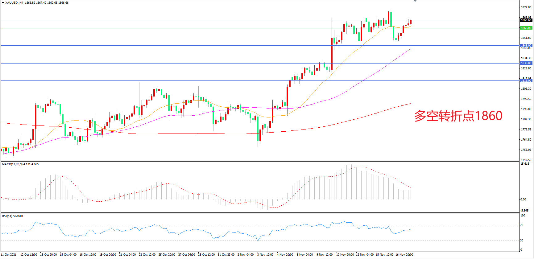 周三(11月17日),高通胀的担忧再次施压欧美市场,欧元区10月CPI同比增4.1%,为欧洲央行通胀目标的两倍,美元指数创出新高后震荡回落,金价温和上涨,收报1866.87美元/盎司。强劲的美国消费数据提振了美联储的加息预期,而美联储决策者就如何应对高通胀的公开辩论升温,重点关注近期美联储高管的发言表现。