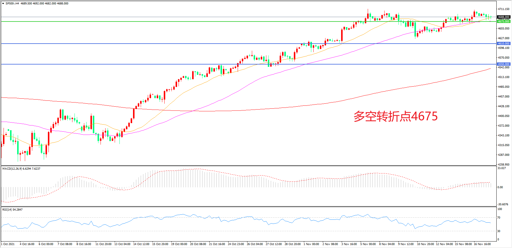 周三(11月17日),高通胀的担忧再次施压欧美市场,美国10月新屋开工户数出乎市场意料不增反降,体现建材价格高和劳动力短缺对建筑商的打击,标普500延续高位震荡,收报4687点。下阶段仍须密切关注通胀预期的变化及美联储对通胀的态度,同时美国近期经济的良好恢复,或许会加大未来业绩的增长压力。