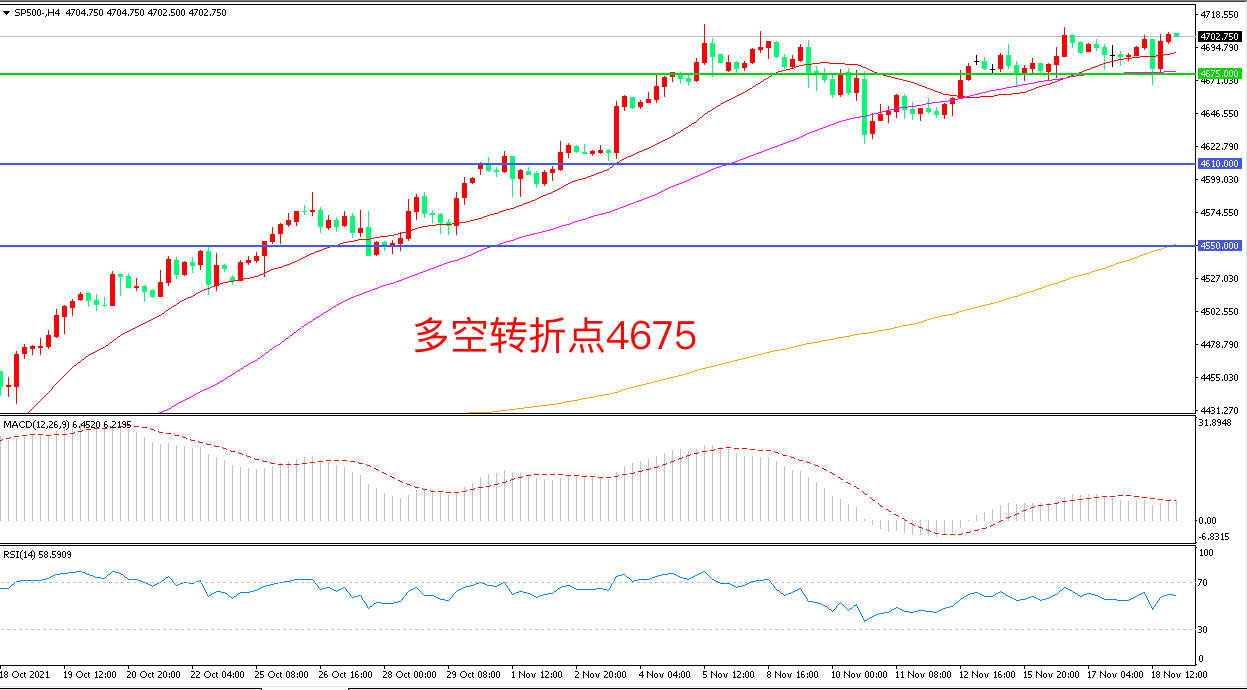 4小时图看,标普500以4675一线为依托延续震荡,短期走势偏强,均线系统粘合形成支撑,MACD红柱缩短,RSI指标走平,日内震荡上行概率较大。