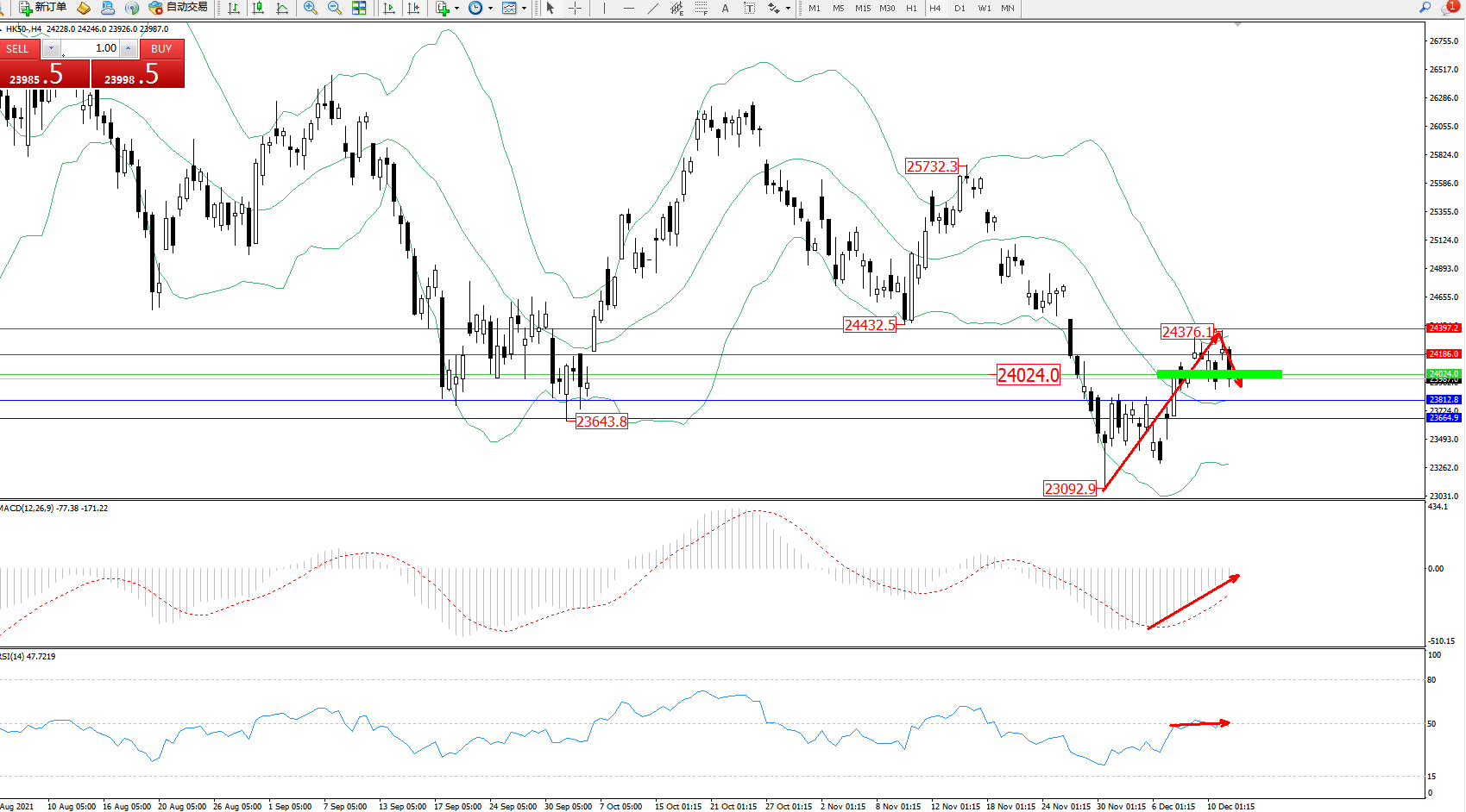 香港恒生指数12月13日(周一)收盘下跌41.14点,跌幅0.17%,报23954.58点;恒指高开低走收跌,恒生科技指数跌0.22%。大型科技股涨跌不一,美团涨2%,腾讯、快手小幅上涨,网易跌近2%,百度、京东下跌0.5%。大市成交额为1296亿港元,南下资金净流入40.42亿港元。中央强调适度开启基础设施投资,基建类股全天强势领涨,中国重汽飙涨逾17%表现最佳,中国建材等纷纷跟涨;截至12月13日,香港共发现5例奥密克戎变异株病例,对此特区政府加强疫情防控,收紧相关防疫检疫条件,采取最高规格的防控措施确保香港与内地“通关”顺利进行。