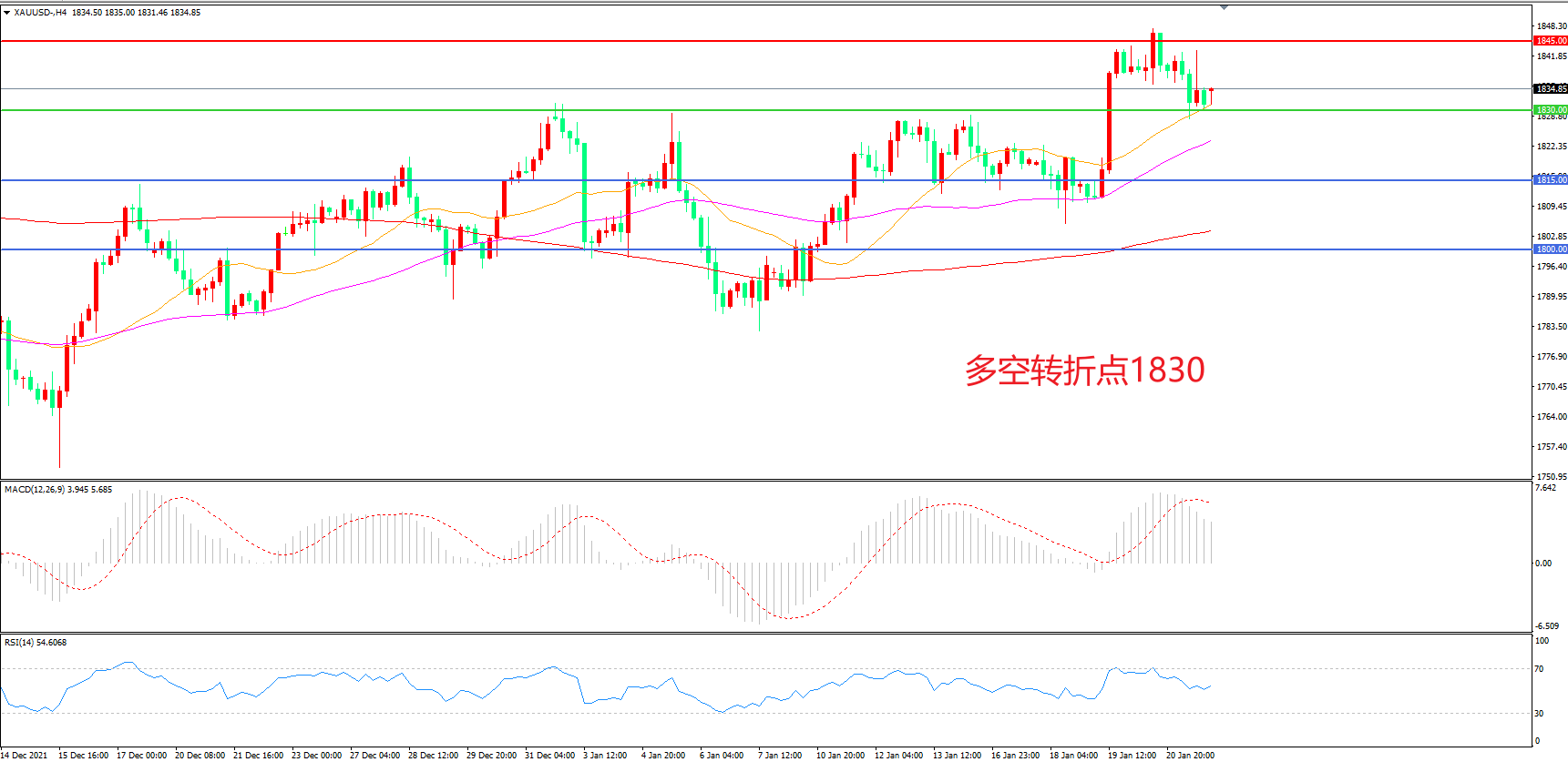 上周五(1月21日),通胀担忧和俄乌地缘政治风险提升了黄金的避险吸引力,但美联储的加息预期对金价形成了压制,现货黄金先涨后跌,收报1831.49美元/盎司。鉴于金价初步站稳在1830附近关键阻力上方,而且美国10年国债收益率承压于2%关口阻力,黄金后市有望继续震荡走高。