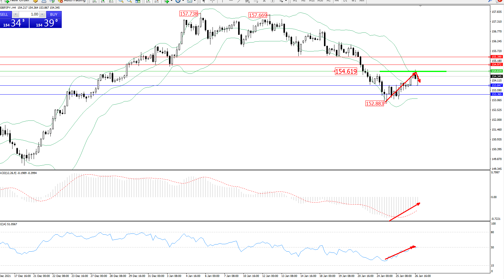 交易策略:154.619下方看跌,目标153.847、153.365