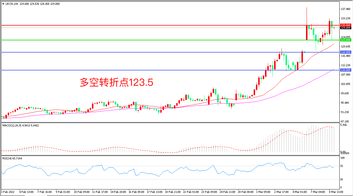 4小时图看,油价回踩21周期均线后再度走高,短期走势偏强,123.5成为多空分水岭,MACD红柱增加,RSI指标走平,日内震荡上行概率较大。