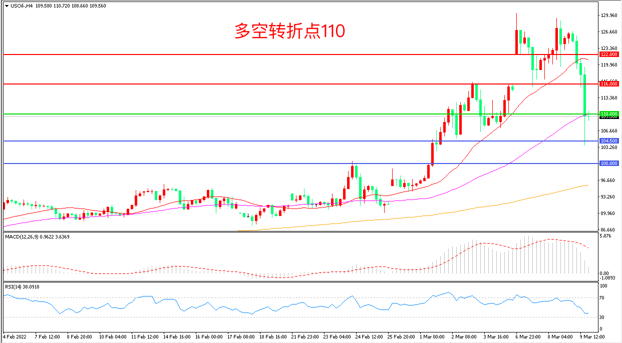 4小时图看,油价长阴连续下坡,前期涨势被吞噬殆尽,110美元成为多空分水岭,MACD红柱缩短,RSI指标走平,日内延续震荡概率较大。