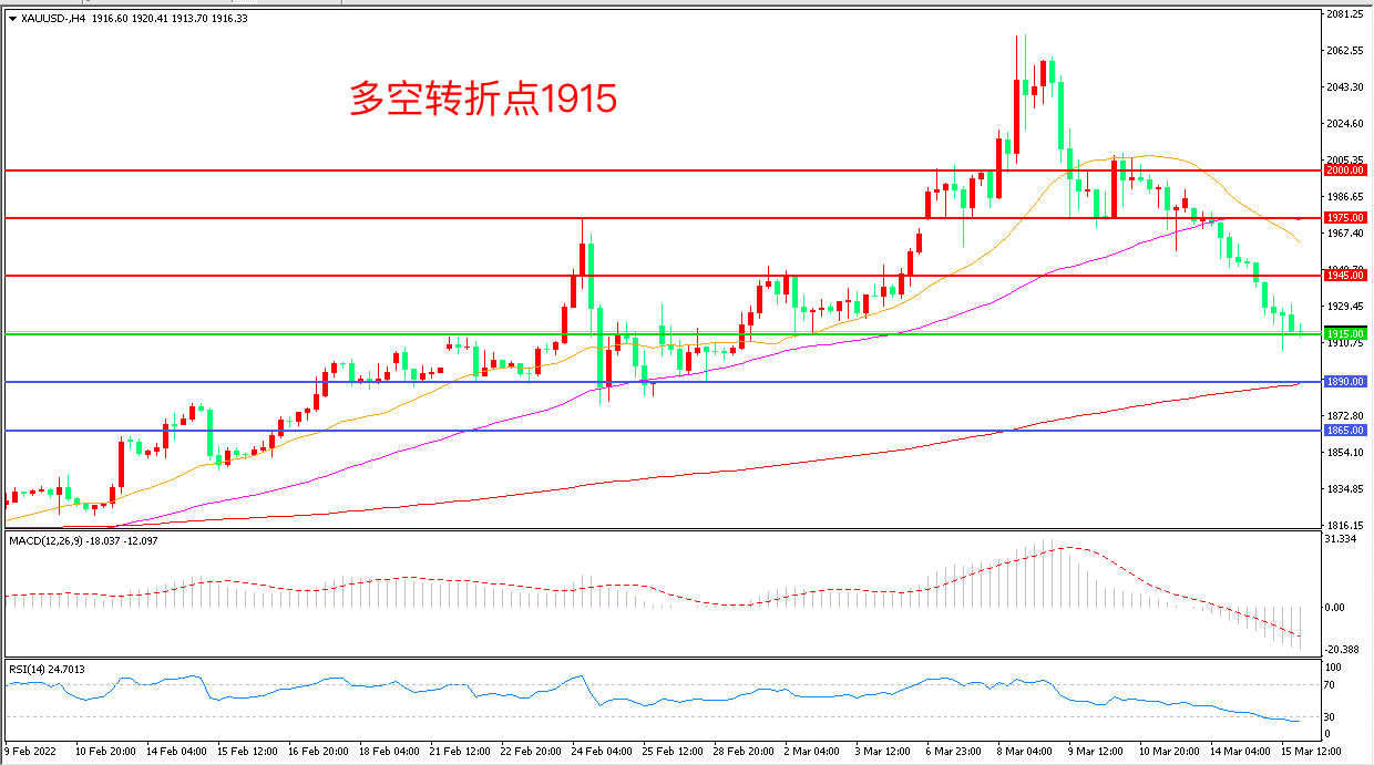 周二(3月15日),“超级央行周”拉开大幕,由美联储领衔,英国、日本等国将公布利率决定,金价在避险情绪回落的打击下再度下挫,收报1915美元/盎司。目前投资者最关心的是美联储进一步明确今年可能升息多少次以及俄乌战争爆发后,美联储更为激进的政策与地缘政治风险之间的关系,预计金价在本周将迎来大幅波动。