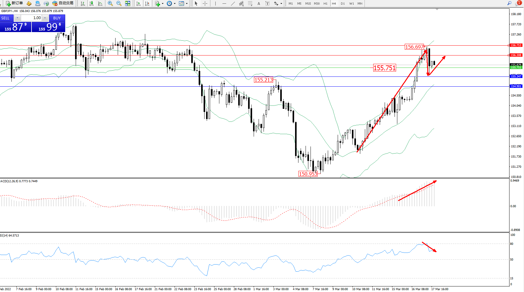 技术点评:多头动力延续布林带指标通道中上轨区间持续震荡上扬,高位抵达156.697位置附近遇阻回撤,短期多头动力上移开始减弱,但上行趋势态势依旧,布林带指标呈上行走势持续中,MACD指标指标多头区域维持震荡上移后开始整理,RSI指标处于多头区域持续震荡上移至超买区80均衡线下侧后开始下行徘徊;