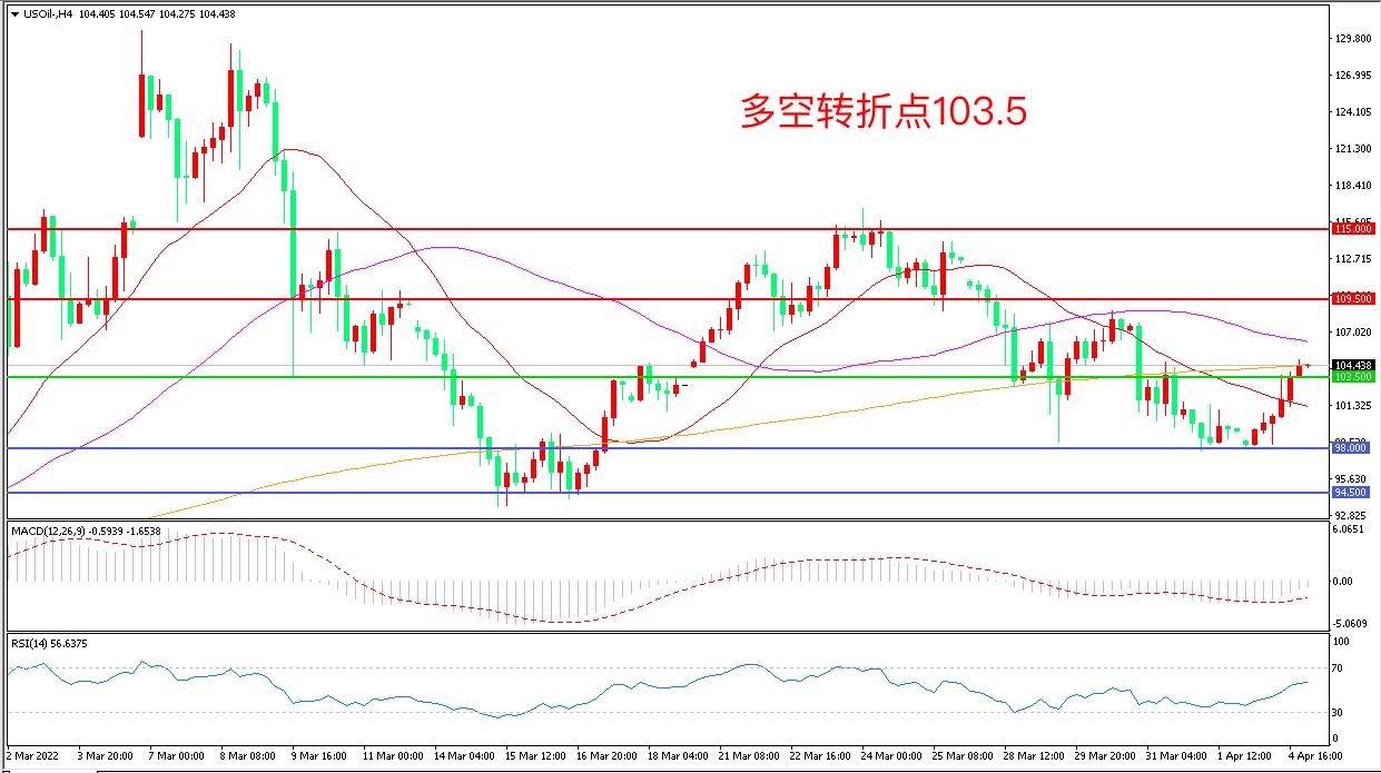 4小时图看,油价回踩98一线后再度拉升,短线走势回暖,55周期均线成为阻力,103.5美元成为多空分水岭,MACD绿柱缩短,RSI指标走平,日内延续震荡概率较大。