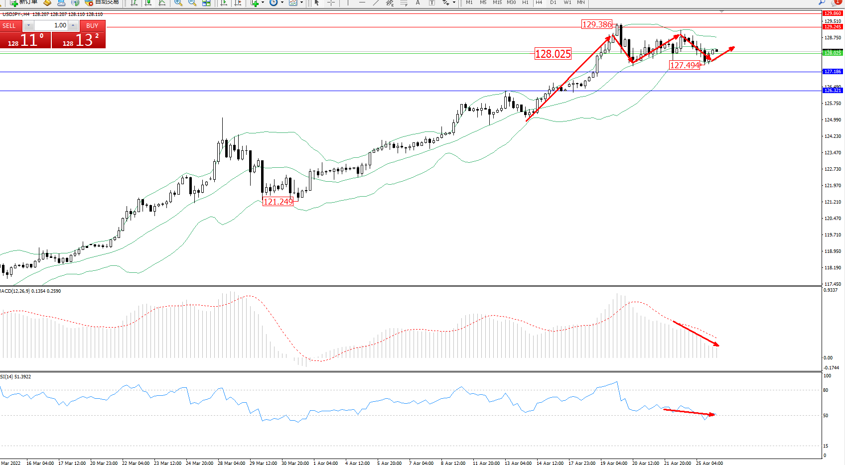 技术点评:多头动力延续布林带指标通道中上轨区间持续震荡上扬,高位抵达129.386附近节点后开始震荡,短期处于高位窄幅整理平移中,多空动力均处于焦灼状态,布林带指标呈收口走势持续徘徊,波幅空间逐渐收窄,MACD指标空头动力维持震荡下行,RSI指标处于50均衡线附近弱势徘徊中;