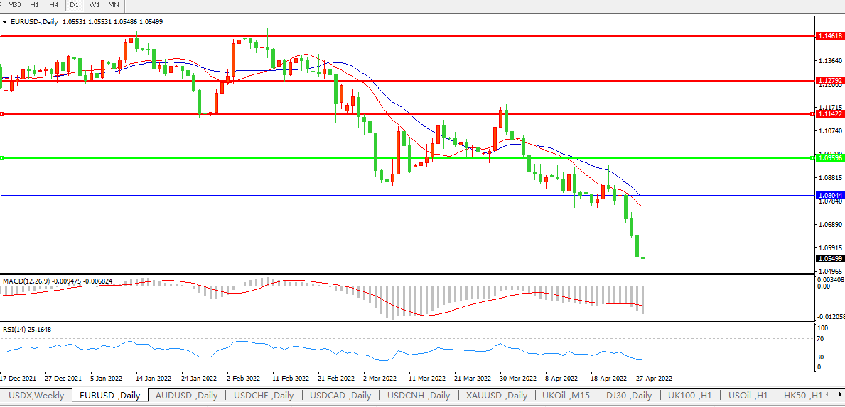 欧元兑美元一度触及1.0515美元的2017年3月以来最低,因技术性支撑位恶化,带来动量和期权相关卖盘;之后回升至1.0561美元。4月迄今,欧元已经下跌4.6%,料将创下七年多来最大的月度跌幅。俄罗斯周三暂停对保加利亚和波兰的天然气供应,因两国拒绝了以卢布结算的要求,此举将矛头直指欧洲经济体,也暴露出欧盟在如何应对俄乌问题上的混乱局面。