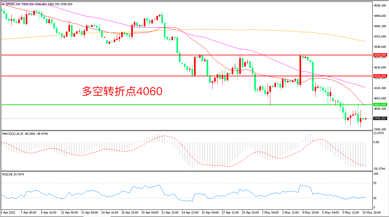 周二(5月10日),多位联储高层支持在接下来2次会议加息50个基点,但这些表态并未给加息预期降温,标普500延续低迷表现,收报3994.05点。通胀冲击,加上人们越来越意识到美联储将不得不加息,促使投资者对股票的高估值持怀疑态度,如果日内的CPI数据再度“爆表”,美股可能迎来更大压力。
