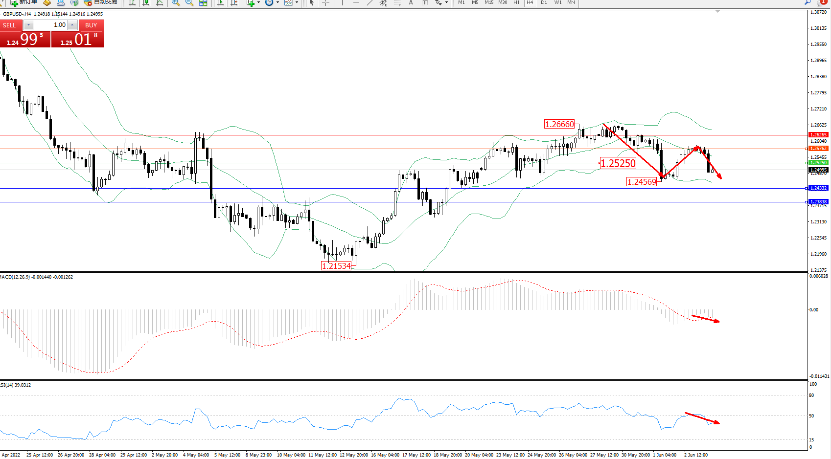 技术点评:空头动力延续布林带指标通道中下轨区间持续震荡下行,布林带指标呈收口走势不断下移,前期低位1.24569位置近在咫尺破位在即,MACD指标处于0轴线下侧维持弱势整理,RSI指标处于50均衡线下侧不断震荡;