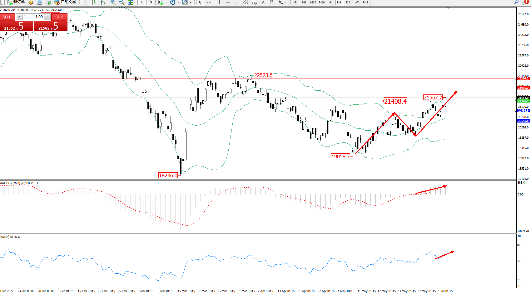 香港恒生指数6月6日(周一)收盘上涨571.77点,涨幅2.71%,报21653.9点;港股尾盘直线拉升,三大指数涨幅进一步扩大,市场全天情绪表现高涨。大型科技股尾盘拉升带动大市走俏,美团绩后涨约10%,百度、快手、阿里巴巴涨超5%,京东涨4.7%,网易、腾讯、小米均拉升。