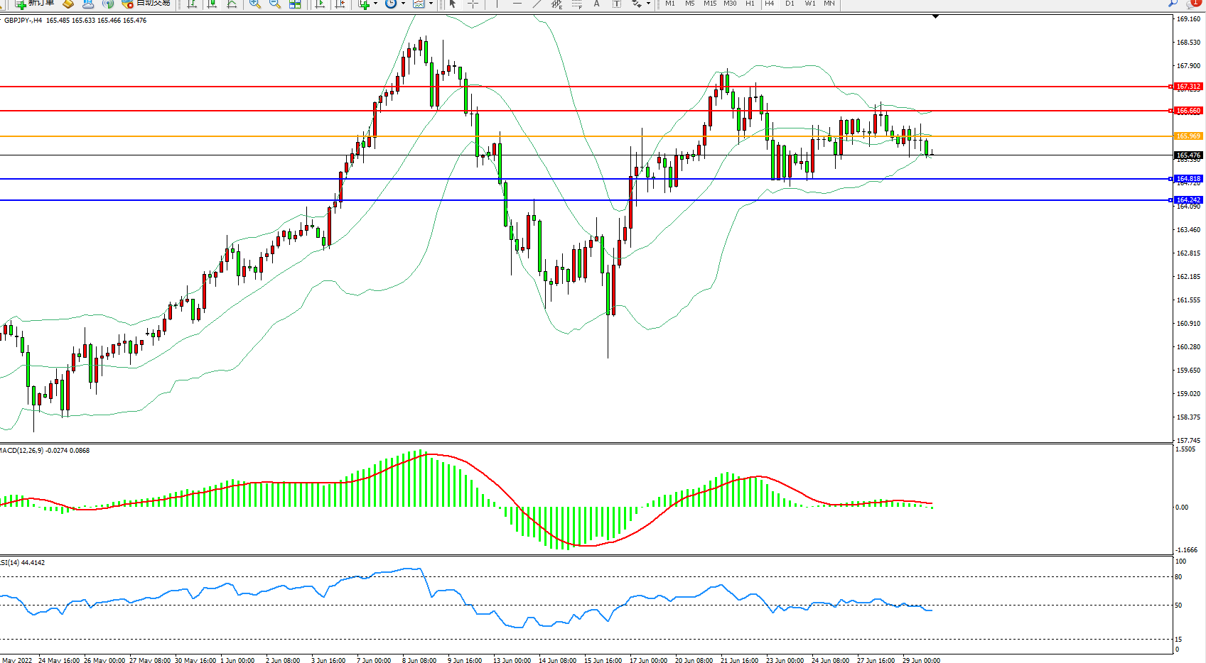 4小时图看:长时间维持在布林带指标通道内震荡,波幅空间逐渐收窄,布林带指标呈收口走势持续中,短期空头动力有伺机入场迹象, MACD指标处于0轴线附近徘徊,RSI指标处于50均衡线附近窄幅整理;