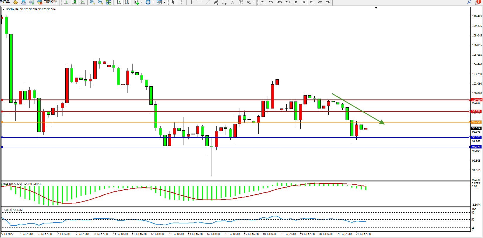 备选策略:97.254上方看涨,目标98.592、100.039